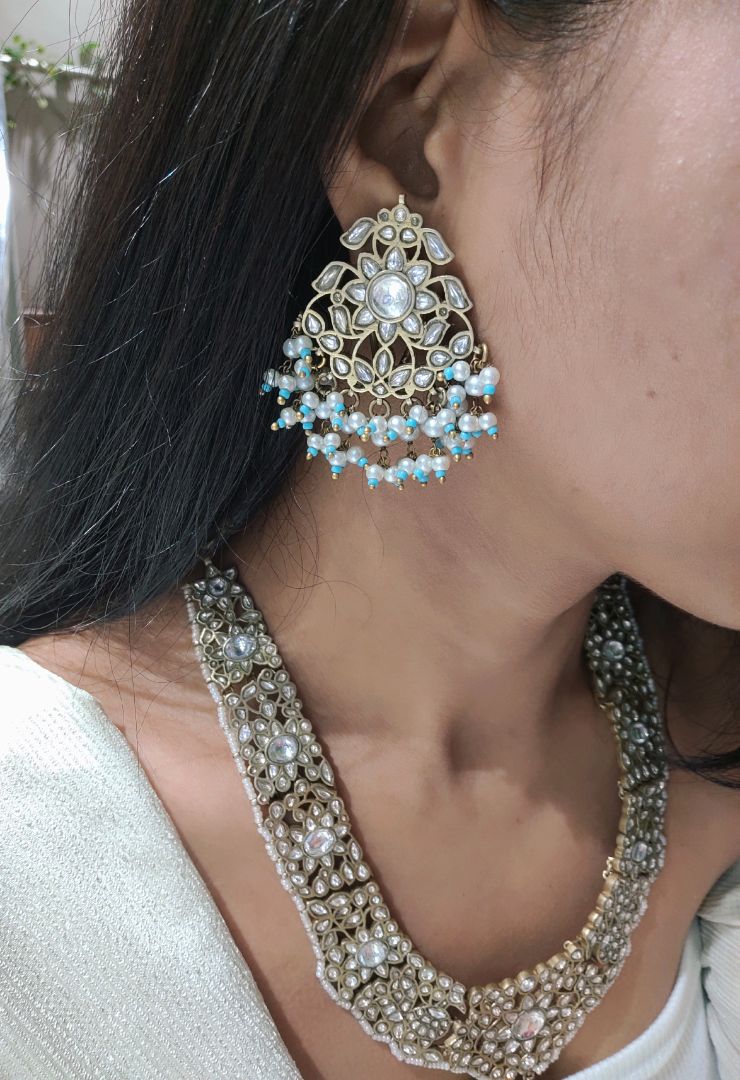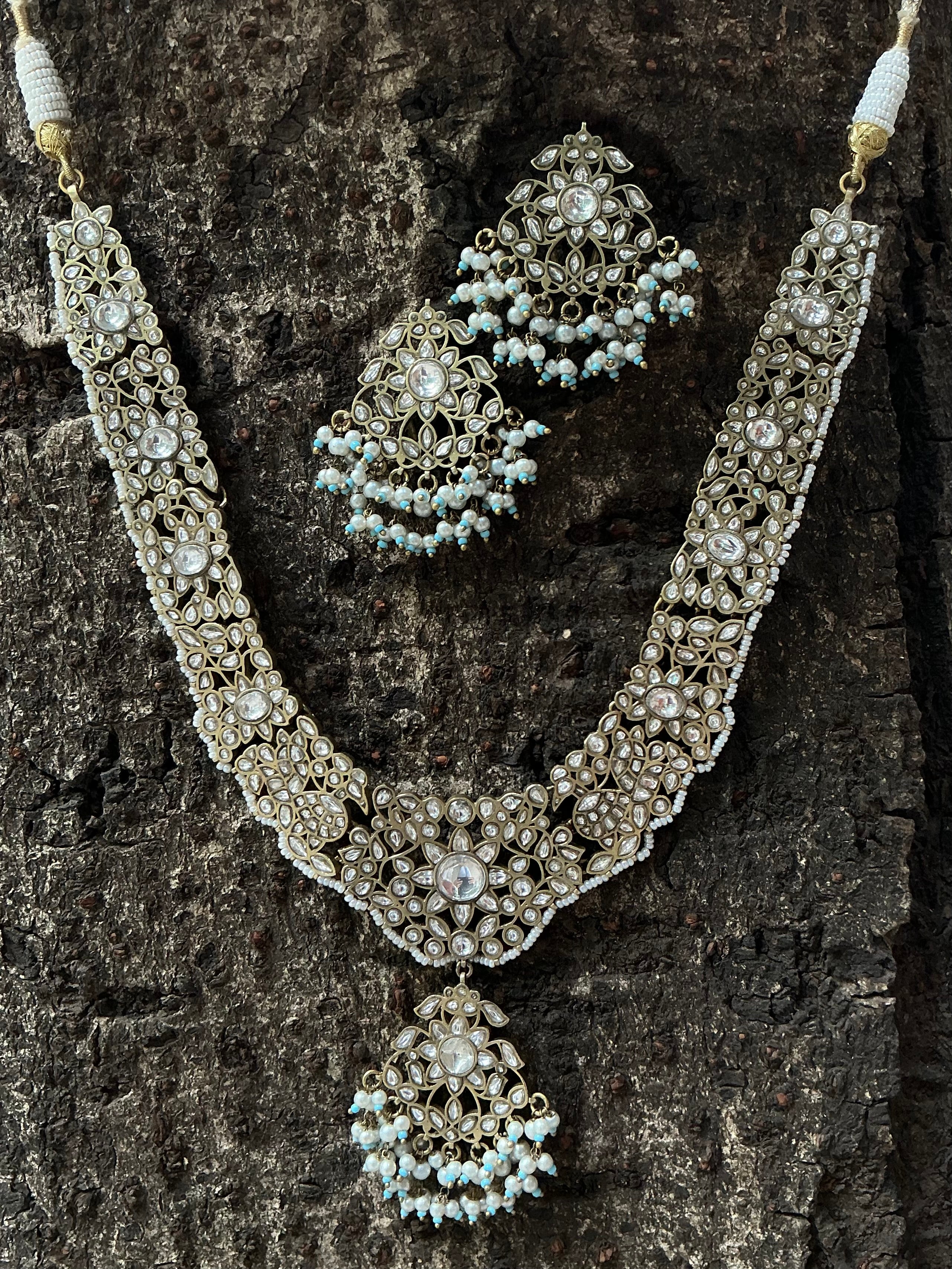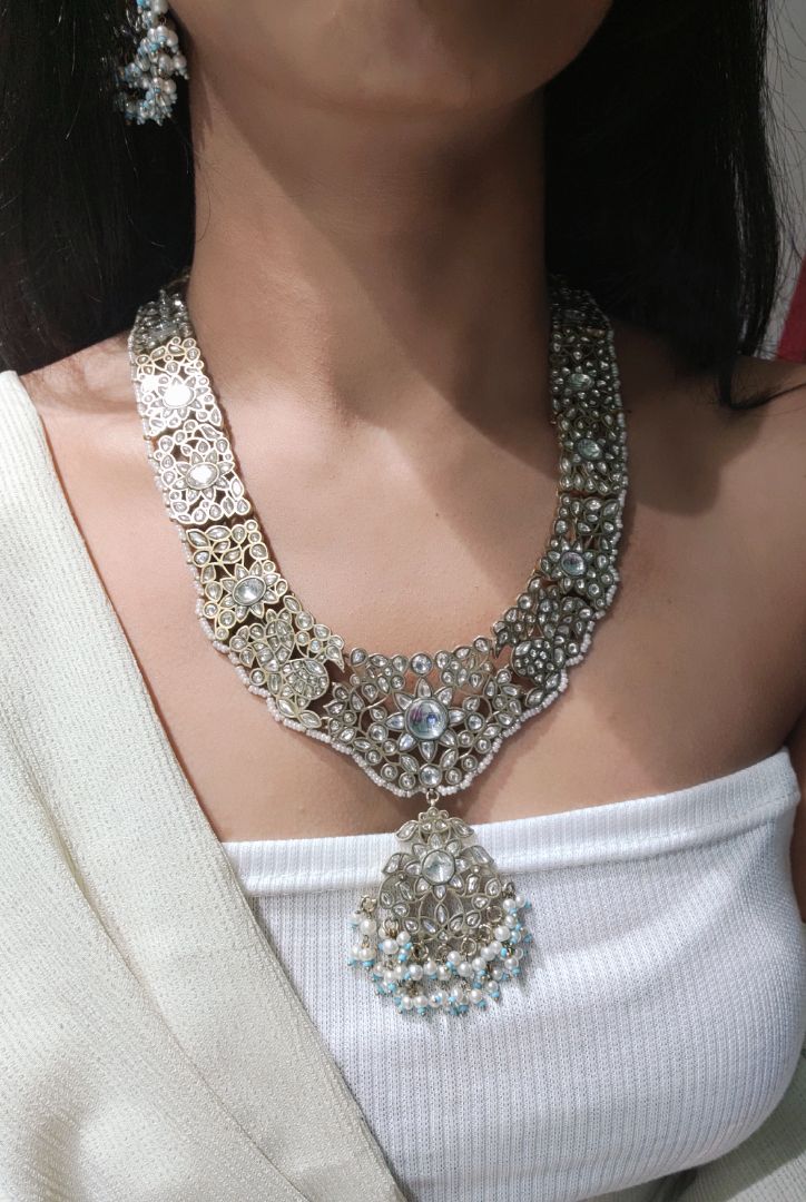 The Mehraab necklace set showcases vintage polki craftsmanship with a setting that delivers an authentically luxurious appearance. Meticulously designed to mirror fine jewelry aesthetics, each component features genuine polki stones set with precision and care. The collection exemplifies traditional artisanal techniques, presenting pieces that command attention through their refined elegance and realistic jewelry-quality finish. Ideal for discerning collectors who seek substantial, heirloom-worthy accessories. This set elevates any occasion with its distinctive character and the unmistakable presence of expertly executed vintage jewelry design.