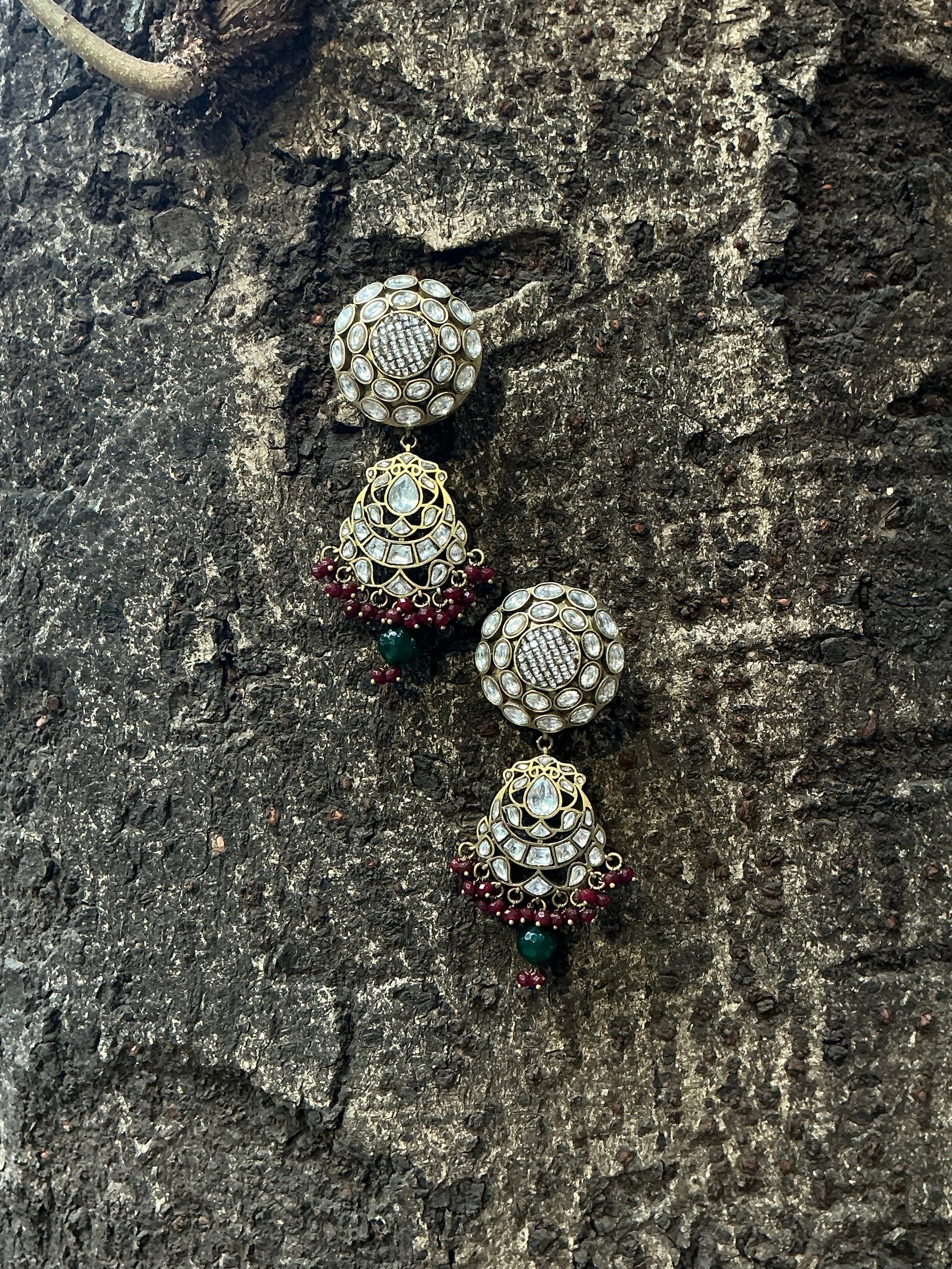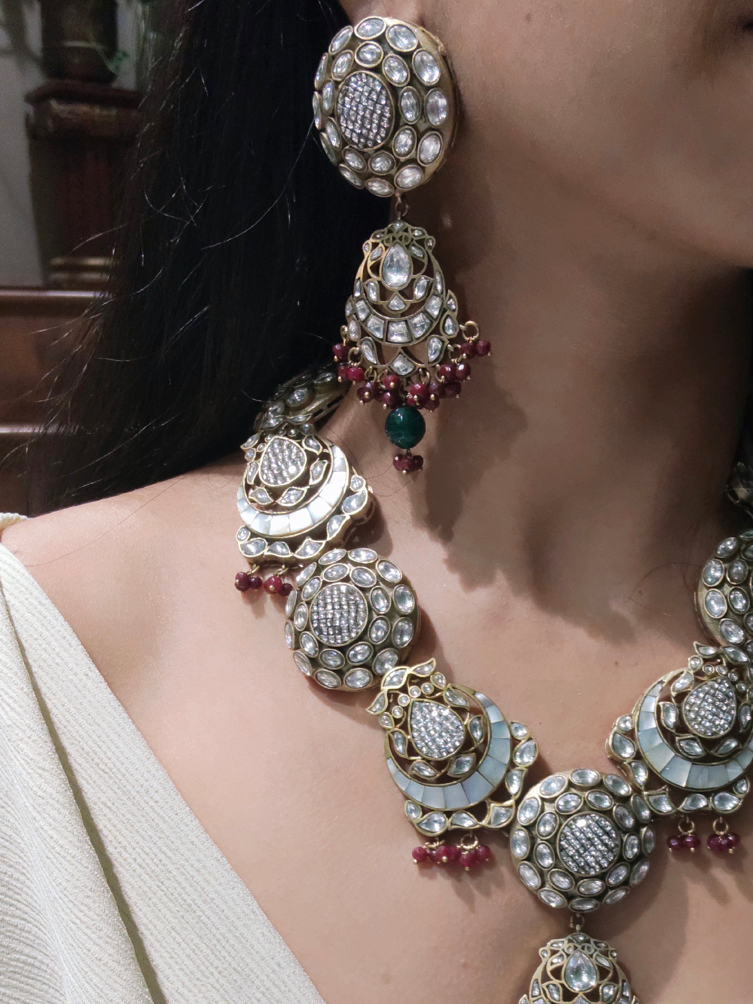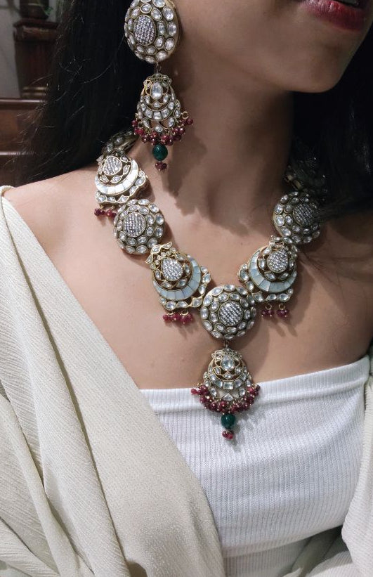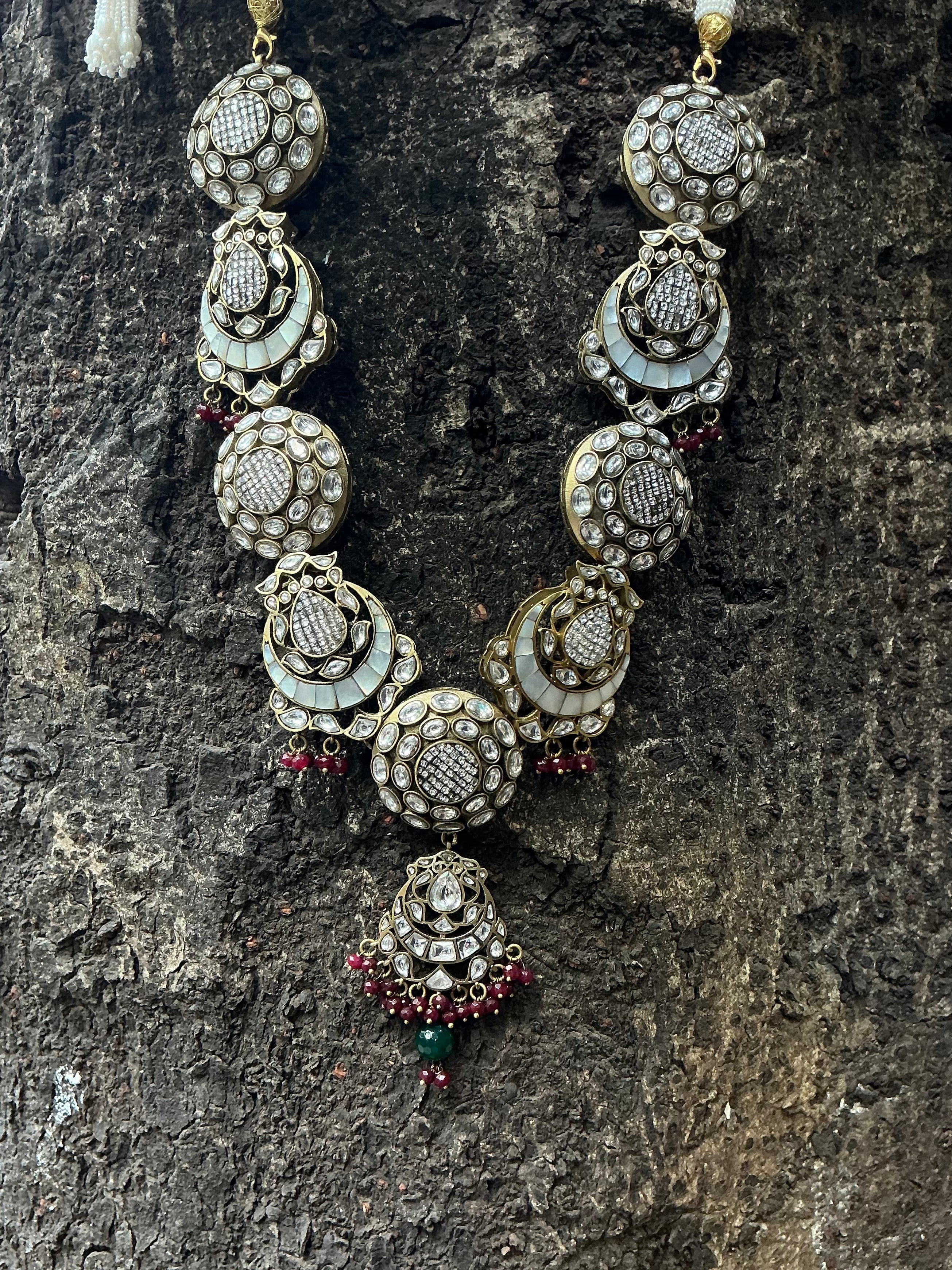 The Sheesh necklace set presents vintage polki jewelry elevated through premium vintage finishing techniques. Each piece showcases authentic polki stones set within carefully crafted metalwork that captures the patina and character of heritage jewelry. The vintage aesthetic creates an heirloom quality that speaks to discerning collectors and those seeking pieces with genuine historical resonance. This collection balances traditional stone-setting artistry with a refined, aged-metal finish that enhances its distinctive appeal. Perfect for occasions demanding sophisticated elegance, the set offers enduring beauty and the unmistakable presence of expertly curated vintage-inspired design.