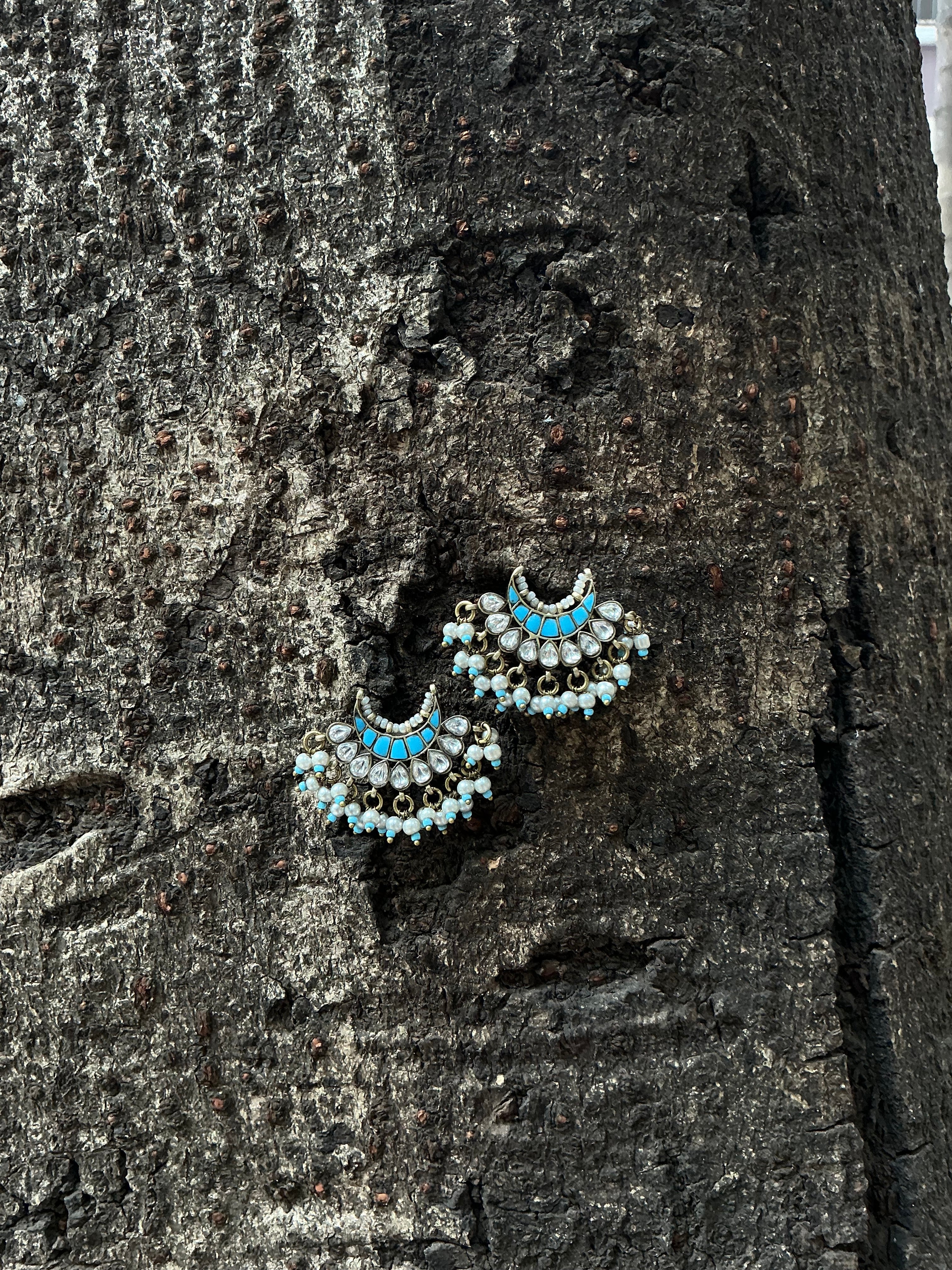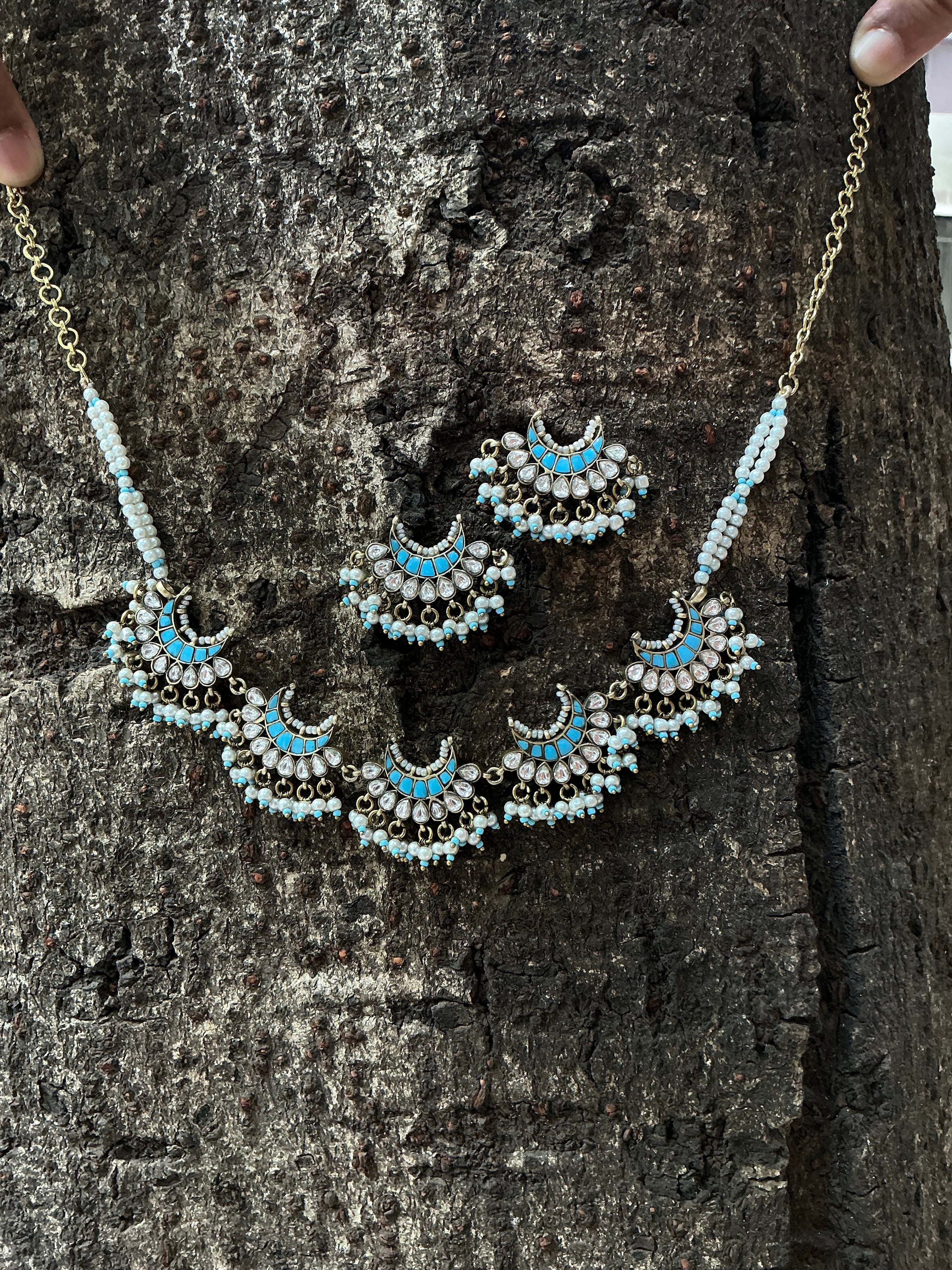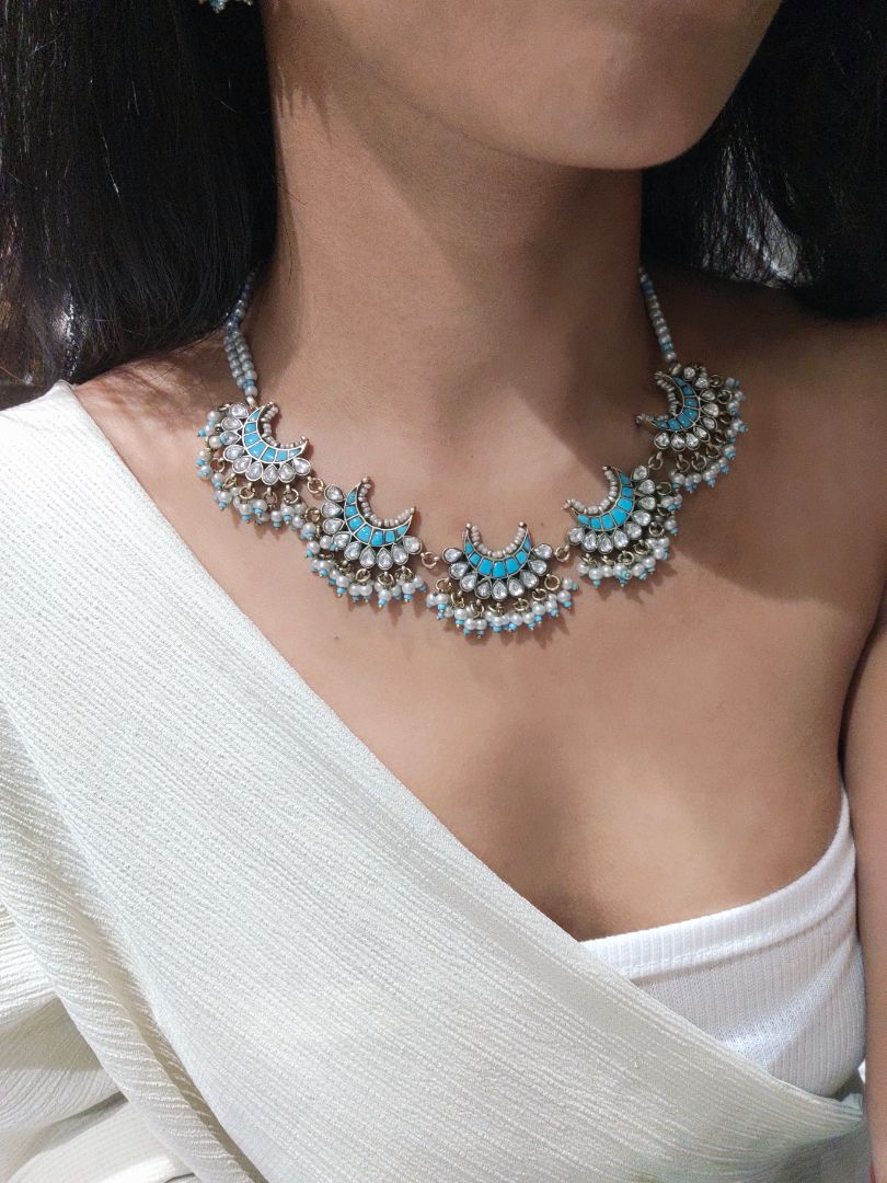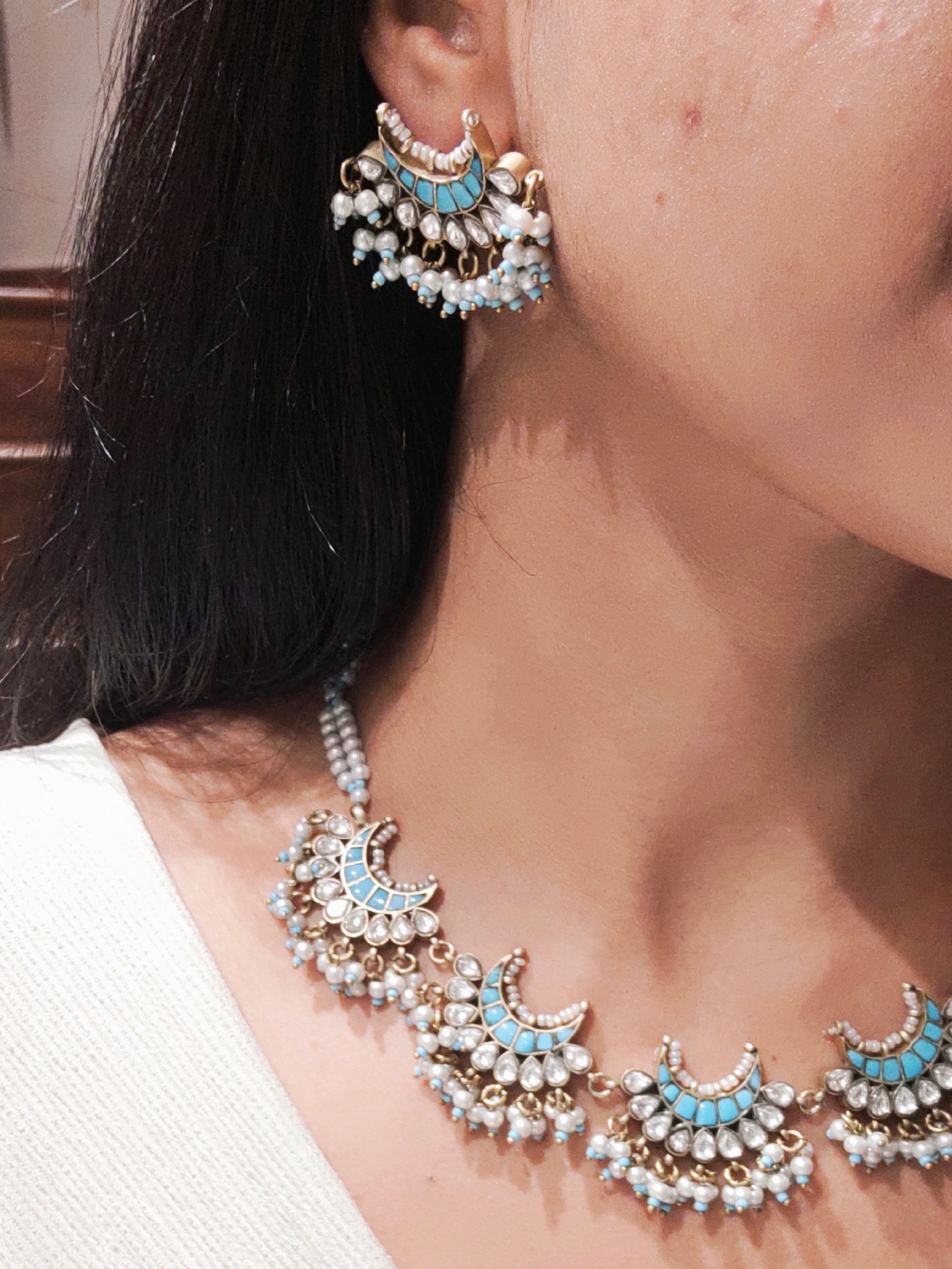 The Shubh necklace set presents vintage polki jewelry elevated through premium vintage finishing techniques. Each piece showcases authentic polki stones set within carefully crafted metalwork that captures the patina and character of heritage jewelry. The vintage aesthetic creates an heirloom quality that speaks to discerning collectors and those seeking pieces with genuine historical resonance. This collection balances traditional stone-setting artistry with a refined, aged-metal finish that enhances its distinctive appeal. Perfect for occasions demanding sophisticated elegance, the set offers enduring beauty and the unmistakable presence of expertly curated vintage-inspired design.