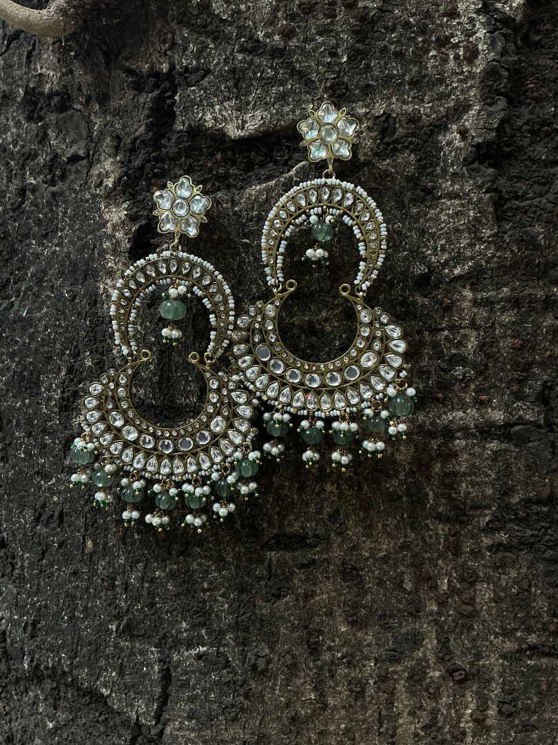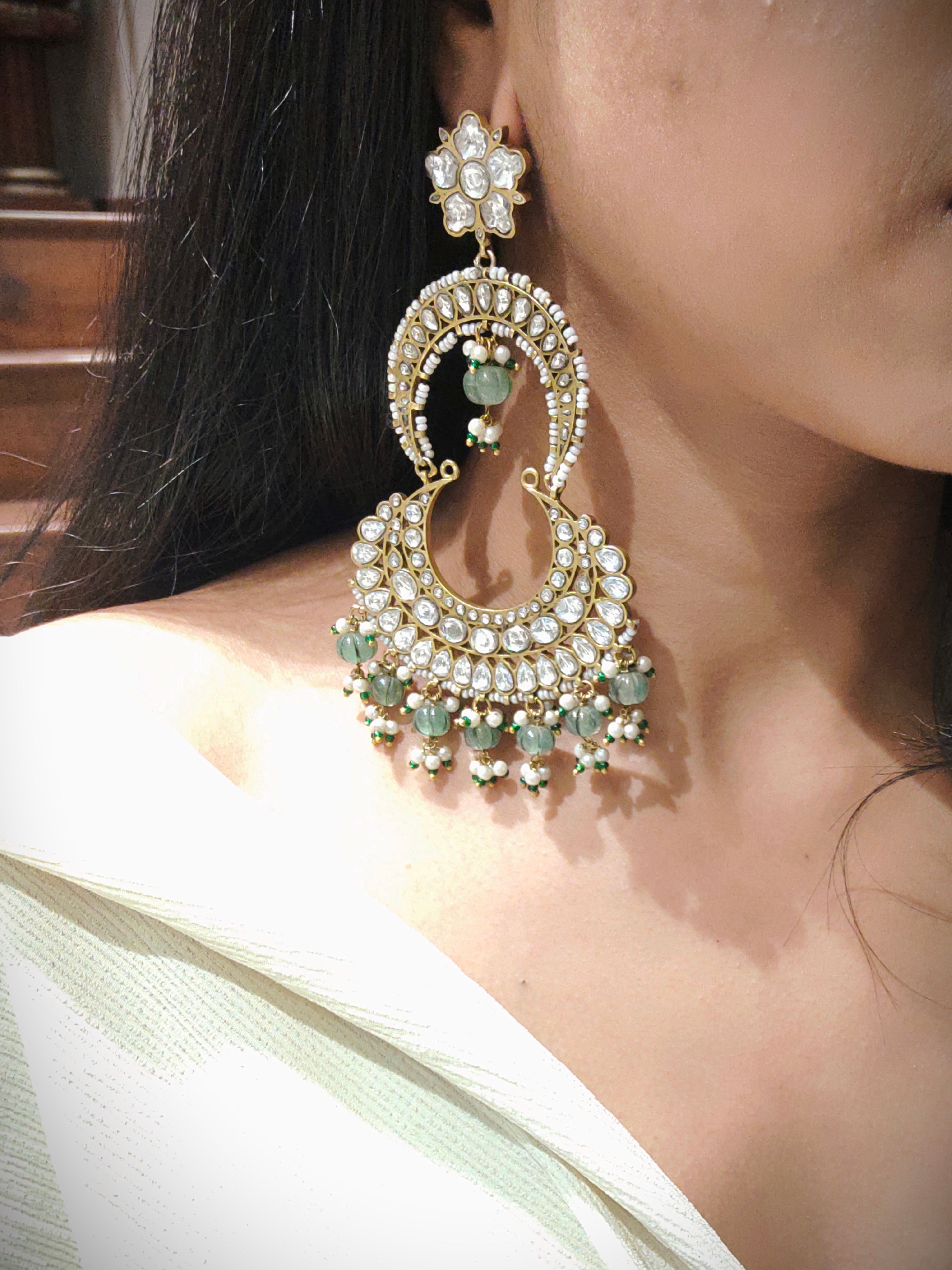 The Taaj-Tara earrings showcase vintage polki craftsmanship finished in premium dull gold, delivering sophisticated elegance with understated refinement. Each earring features authentic polki stones meticulously set within matte gold metalwork that evokes timeless luxury. The dull gold finish complements the natural brilliance of the stones while maintaining a contemporary sensibility that transcends seasonal trends. Designed for those who value traditional artisanal techniques paired with modern aesthetic preferences, these earrings transition seamlessly from formal occasions to refined everyday wear. An essential investment piece that embodies heritage craftsmanship and enduring style.